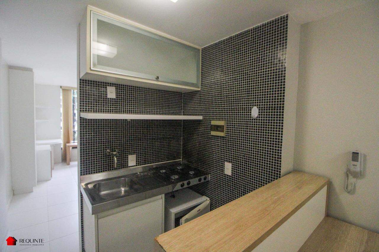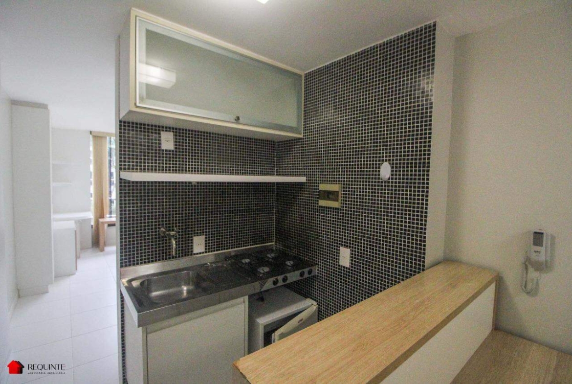* Cozinha americana com armário planejados, frigobar, fogão embutido e bancada para refeições,