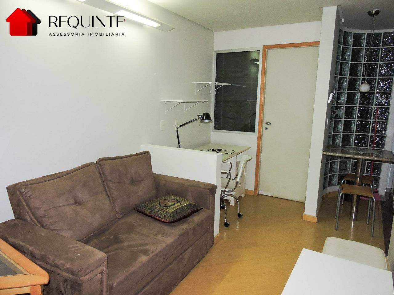 * Sala de estar com sofá, rack e bancada para estudos,